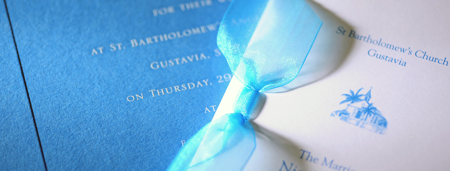 We are able to create hand-engraved invitations with coloured borders and with luxurious tissue lined envelopes, formal "stiffy" invitations with gilt edges, banded wedding booklets incorporating invitations and further information, as well as any other personal stationery items you might wish for. We are not the cheapest, but we believe that our quality and service is worth paying for.
