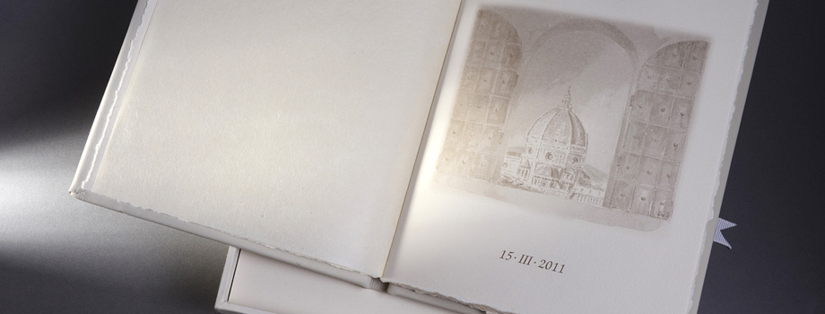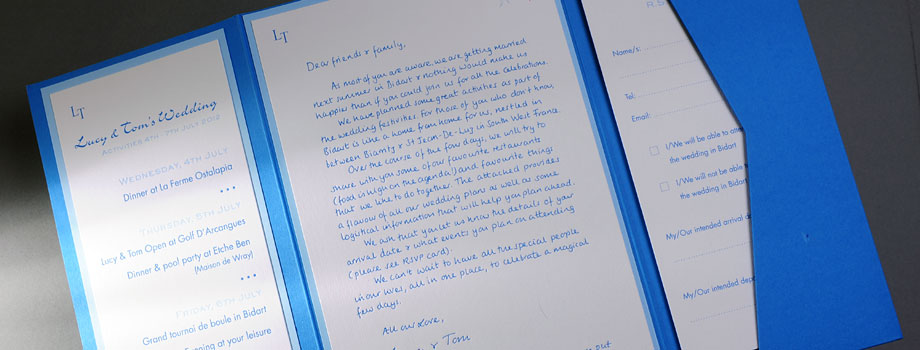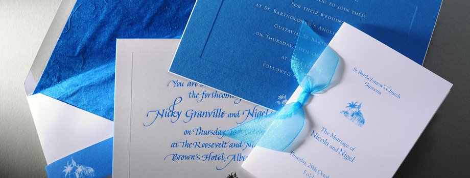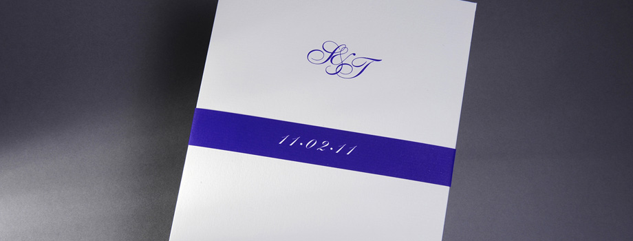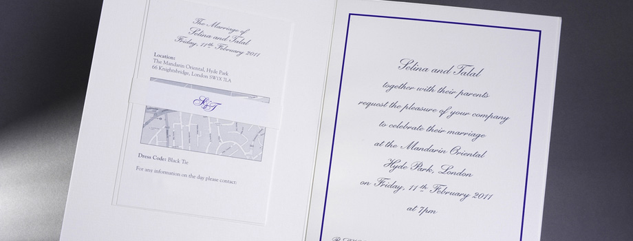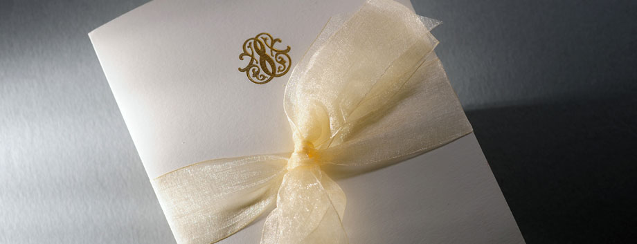 We have produced a number of beautiful wedding folders with inserts and hand-tied ribbons and we are justifiably proud of our exquisite wedding booklets, which may have gilt-edged or hand-torn pages, hand-bound in silk or soft textured leather inside and may come within a specially created slipcase with embossed monogram. These are costly but are the ultimate in luxury wedding stationery.